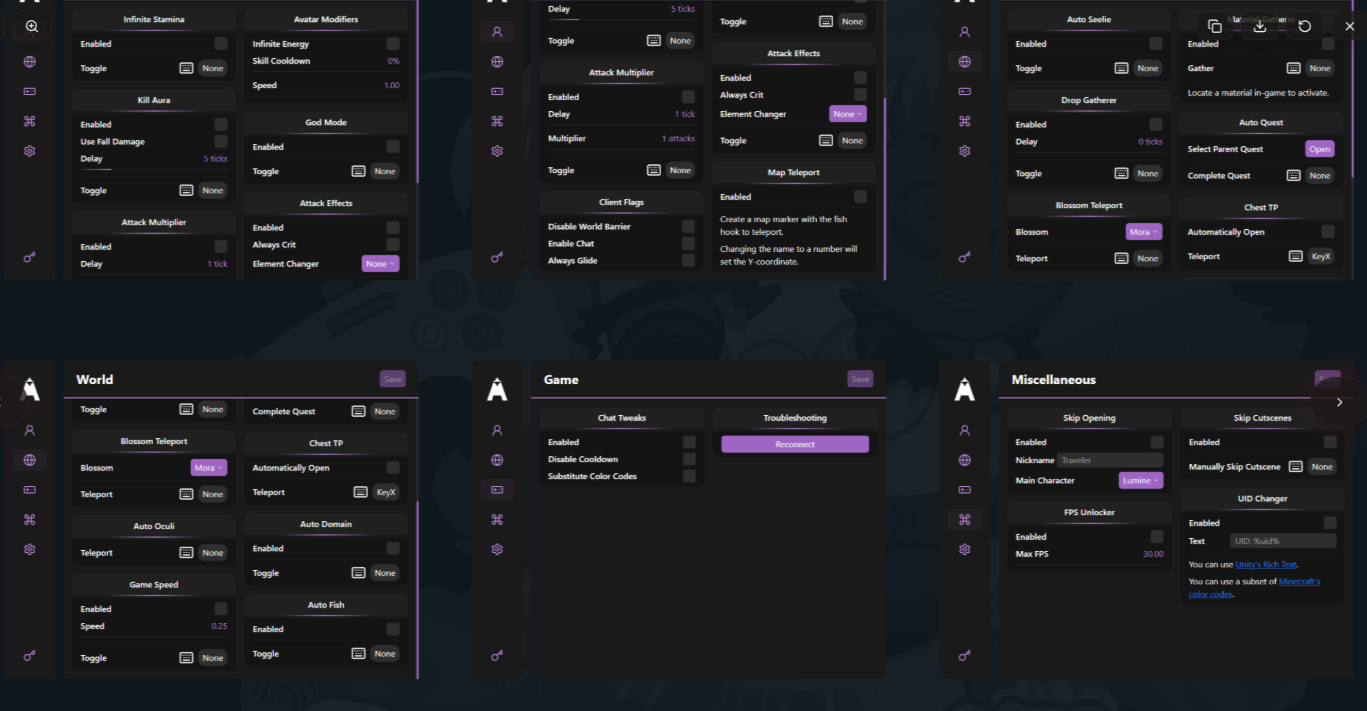Vision+ открывает безграничные возможности в Genshin Impact. Чит включает более 50 функций для полного контроля над игровым миром: мгновенный телепорт к любым точкам карты, автоматический фарм ресурсов и артефактов, умные боевые скрипты, свободный полет над Тейватом, сбор всех растений и руд, оптимизацию квестов и многое другое. Технология Stealth Mode обеспечивает полную безопасность вашего аккаунта.